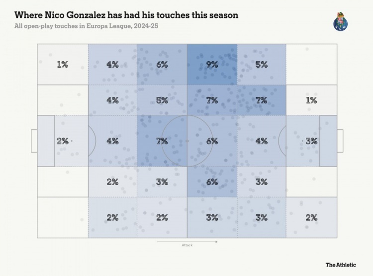 從下面這個比賽熱圖,我們也能發(fā)現(xiàn),尼科-岡薩雷斯在波爾圖擔(dān)任雙支點角色之時經(jīng)常轉(zhuǎn)移到中場左側(cè)。