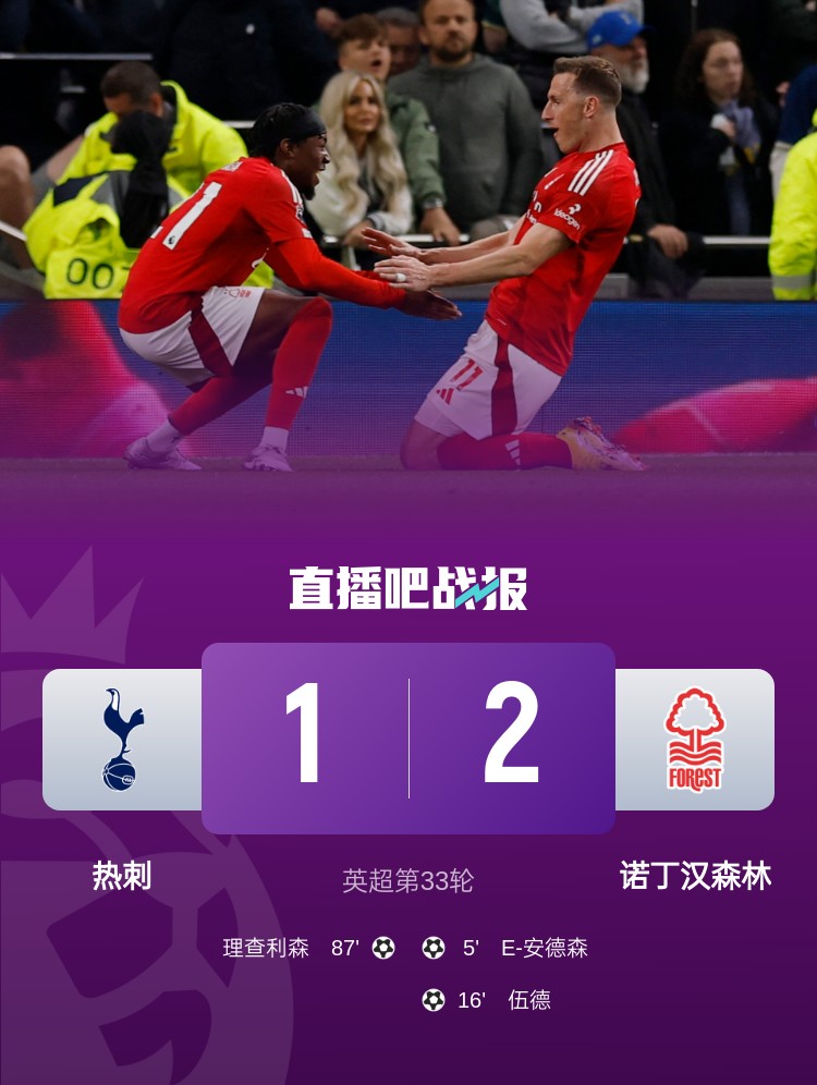 7輪僅1勝!熱刺1-2遭森林賽季雙殺 森林終結(jié)英超2連敗&升第3