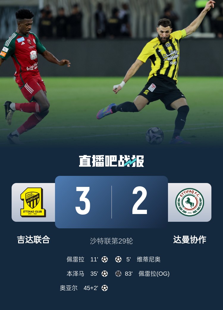 沙特聯(lián)-吉達(dá)聯(lián)合3-2達(dá)曼協(xié)作6分領(lǐng)跑 本澤馬傳射佩雷拉破門+烏龍