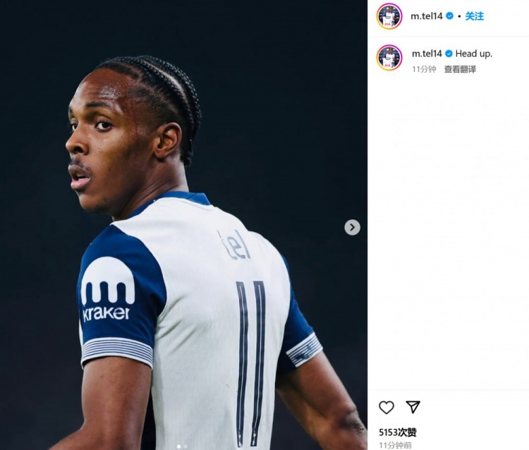 他也在賽后通過社媒曬出自己的比賽照紀念熱刺首秀,并鼓勵全隊:“抬起頭來。”