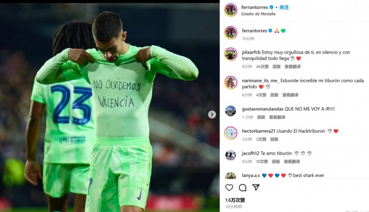 他也在進球后掀開球衣,露出內(nèi)衣上的“我們不要忘記瓦倫西亞”字樣,并且在賽后通過社媒曬照并配上????????符號。