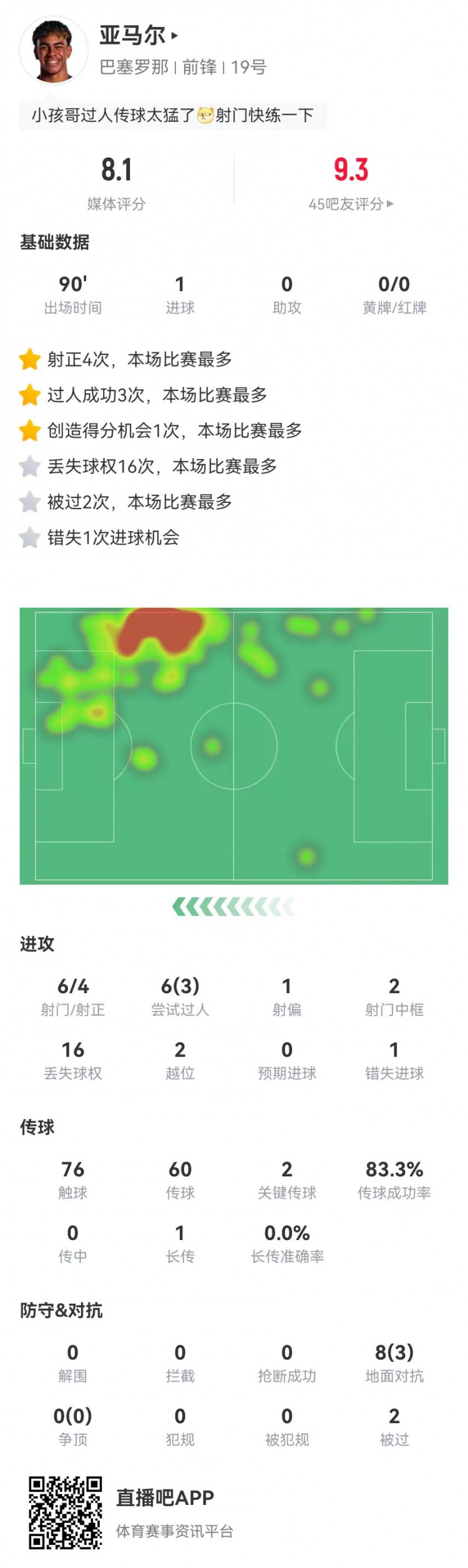 2月7日訊 巴薩在本輪國(guó)王杯5-0大勝瓦倫,亞馬爾本場(chǎng)數(shù)據(jù)如下: