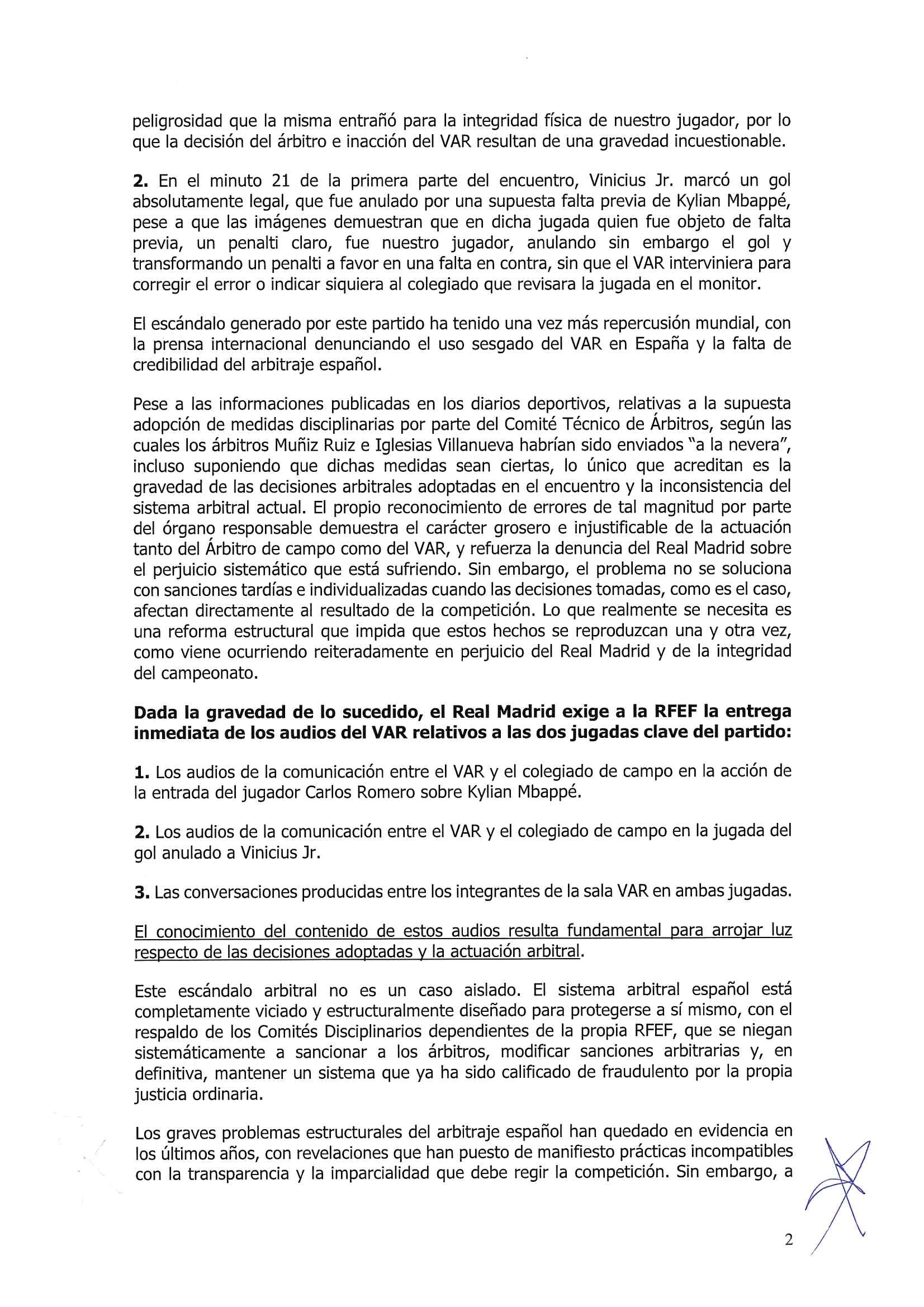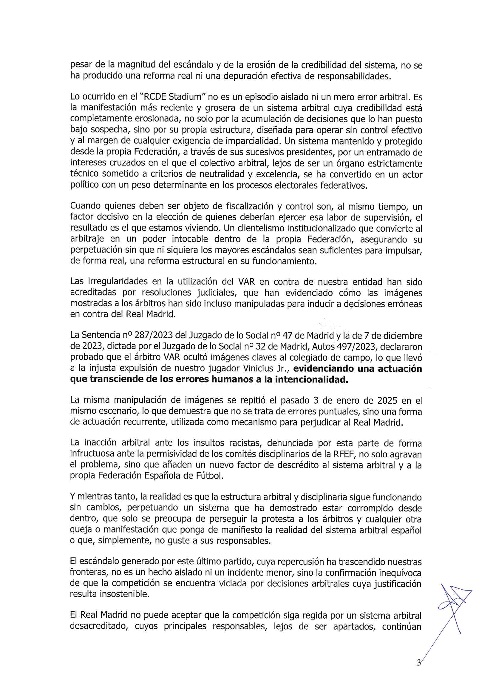 馬德里第47社會法庭的判決書編號287/2023,以及由馬德里第32社會法庭于2023年12月7日發(fā)出的判決書,案件編號497/2023,證實了VAR裁判員向現(xiàn)場裁判員隱瞞關(guān)鍵影像的事實,這導致我們的球員維尼修斯被不公正地罰下場。這一行為超越了人為錯誤范疇,顯示出其有意為之。