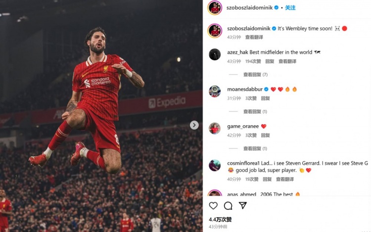 索博斯洛伊也在賽后通過社媒曬出自己的慶祝照,并配文:“接下來是溫布利時(shí)間!”利物浦將在溫布利舉行的聯(lián)賽杯決賽對陣紐卡。