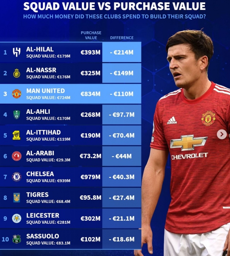 2月8日訊 《轉(zhuǎn)會市場》統(tǒng)計了當(dāng)前陣容身價低于引進(jìn)費用情況,前5名中有4支沙特球隊。