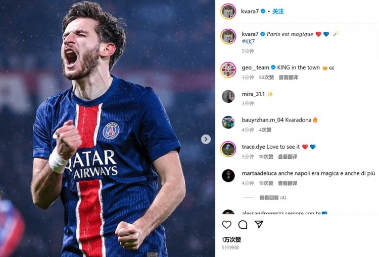 克瓦拉茨赫利亞也在賽后通過社媒曬出自己的慶祝照,并配文:“巴黎充滿了魔力?!?/p>
