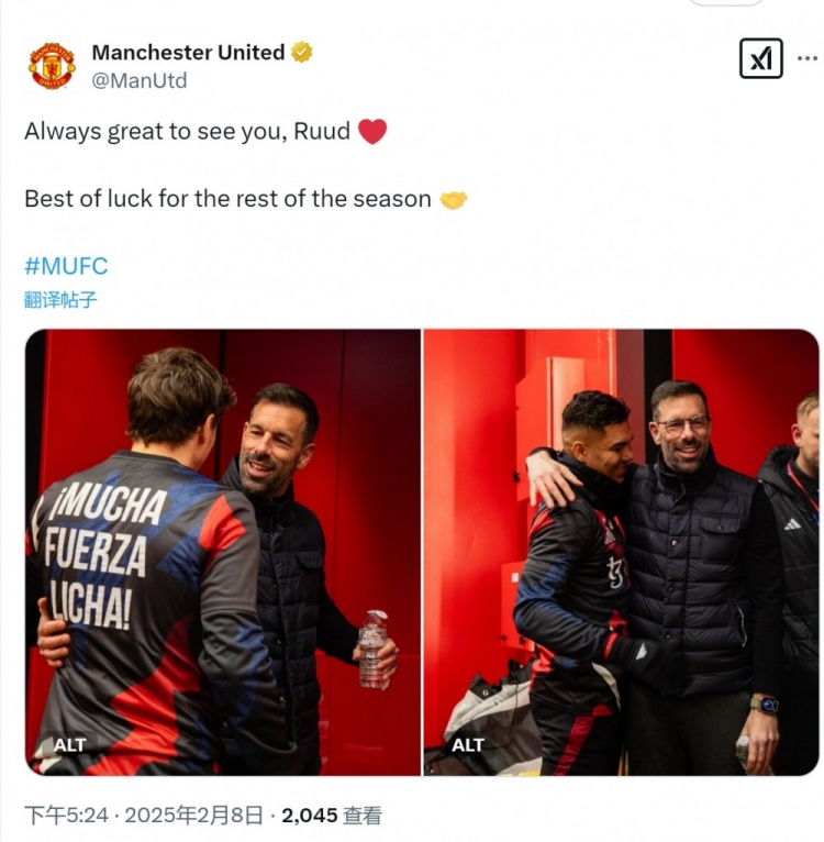 曼聯(lián)官方社媒曬出范尼的照片,配文:“很高興見(jiàn)到你,魯?shù)?。祝你本賽季剩余的比賽好運(yùn)?!?/p>