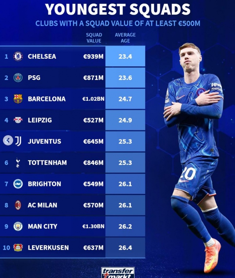 各隊(duì)平均年齡最年輕榜:切爾西巴黎巴薩列前三,尤文米蘭曼城在列