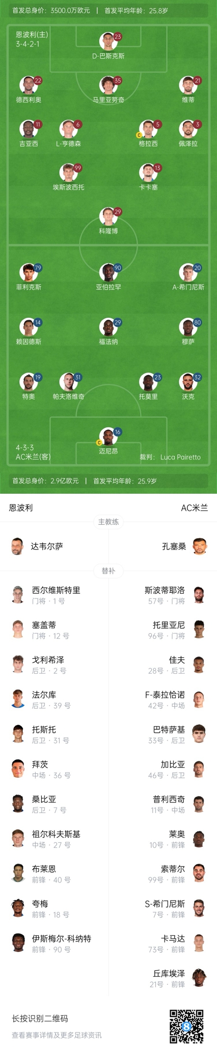 2月9日訊 意甲第24輪 恩波利主場迎戰(zhàn)AC米蘭,賽前首發(fā)名單公布。