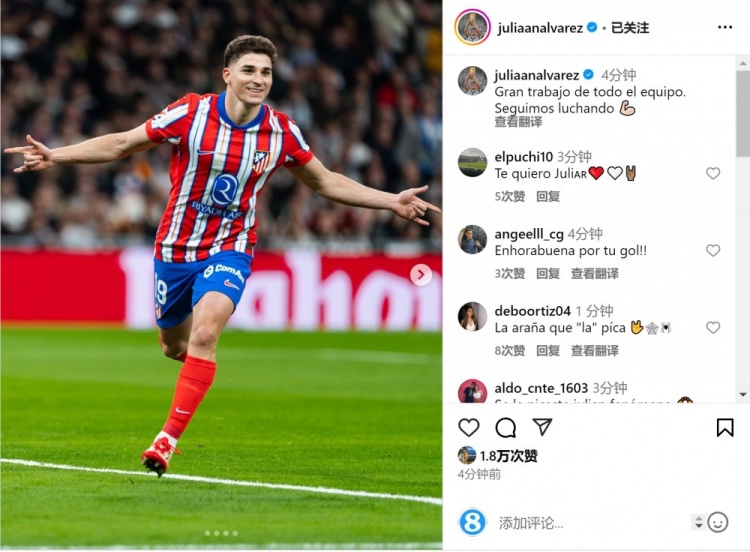 阿爾瓦雷斯社媒曬出自己慶祝進球的照片,配文:“整支球隊都表現(xiàn)出色,我們繼續(xù)戰(zhàn)斗!”