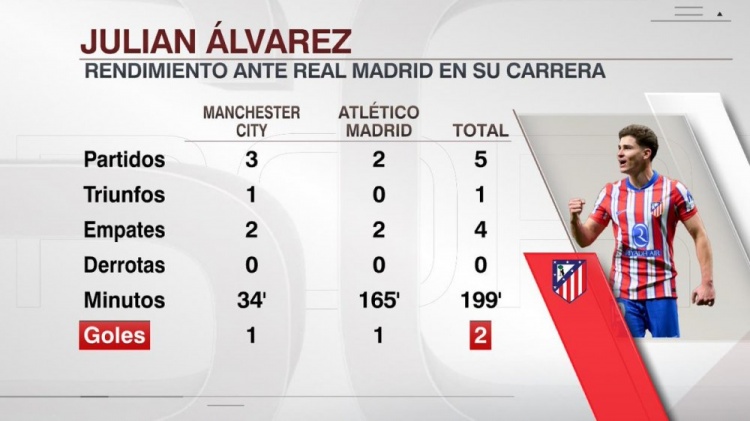 ESPN統(tǒng)計(jì)了阿爾瓦雷斯職業(yè)生涯至今對(duì)陣皇馬的數(shù)據(jù),他所在的球隊(duì)1勝4平保持不敗。