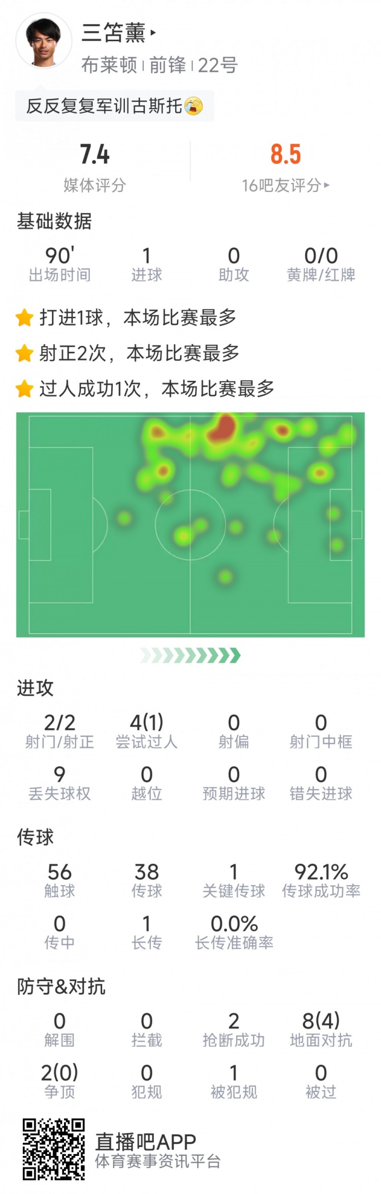 2月9日訊 在本輪足總杯,布萊頓2-1擊敗切爾西,三笘薫打進一球,以下為他在本場數(shù)據(jù):