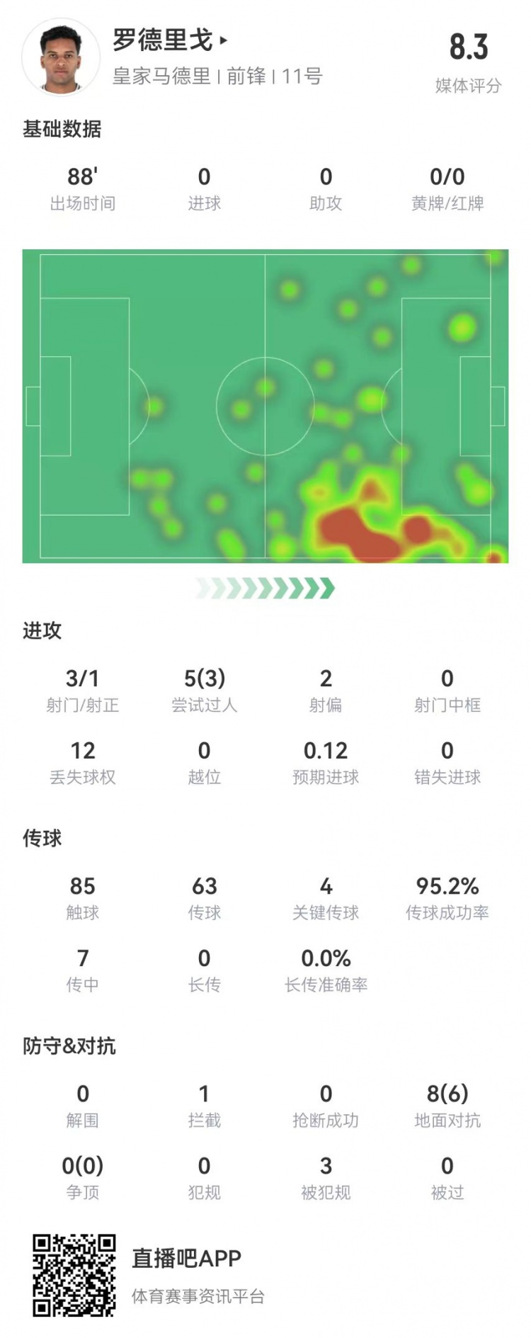 2月9日訊 皇馬在本輪西甲對陣馬競,羅德里戈本場數(shù)據(jù)如下: