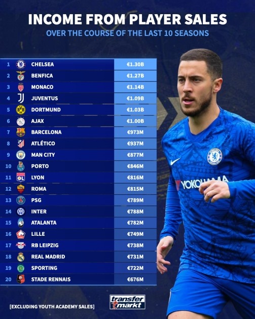 2月9日訊 德國轉(zhuǎn)會(huì)市場(chǎng)統(tǒng)計(jì)了近10個(gè)賽季各俱樂部出售球員所得收入的排名,切爾西通過賣球員賺到13億歐元轉(zhuǎn)會(huì)費(fèi),排名第一。
