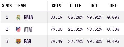 機構目前預測本賽季最終皇馬積分將達到83分,馬競和巴薩均為79分。