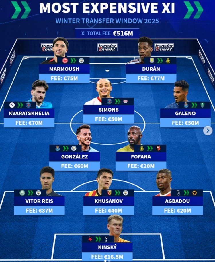 2月9日訊 《轉(zhuǎn)會市場》統(tǒng)計了冬窗轉(zhuǎn)會費最貴陣容,曼城4位新援在列。