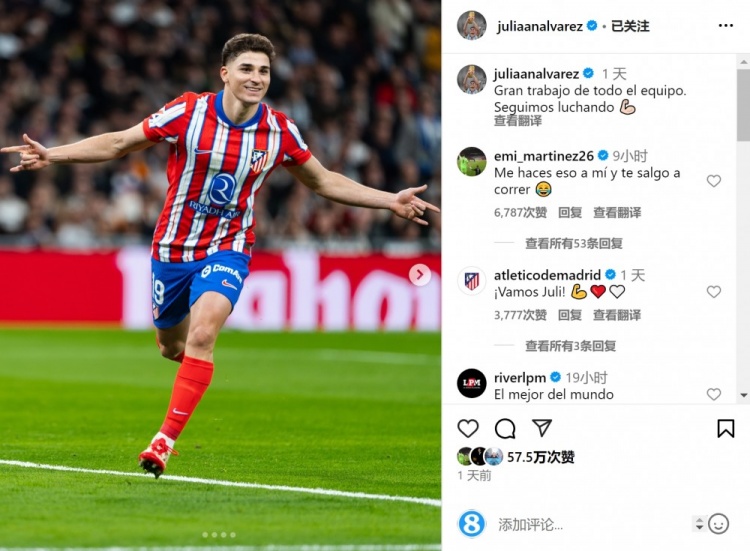 阿爾瓦雷斯社媒曬照,阿根廷門將大馬丁留言調(diào)侃道:“如果你敢這樣對我,我會追著你跑?!?/p>