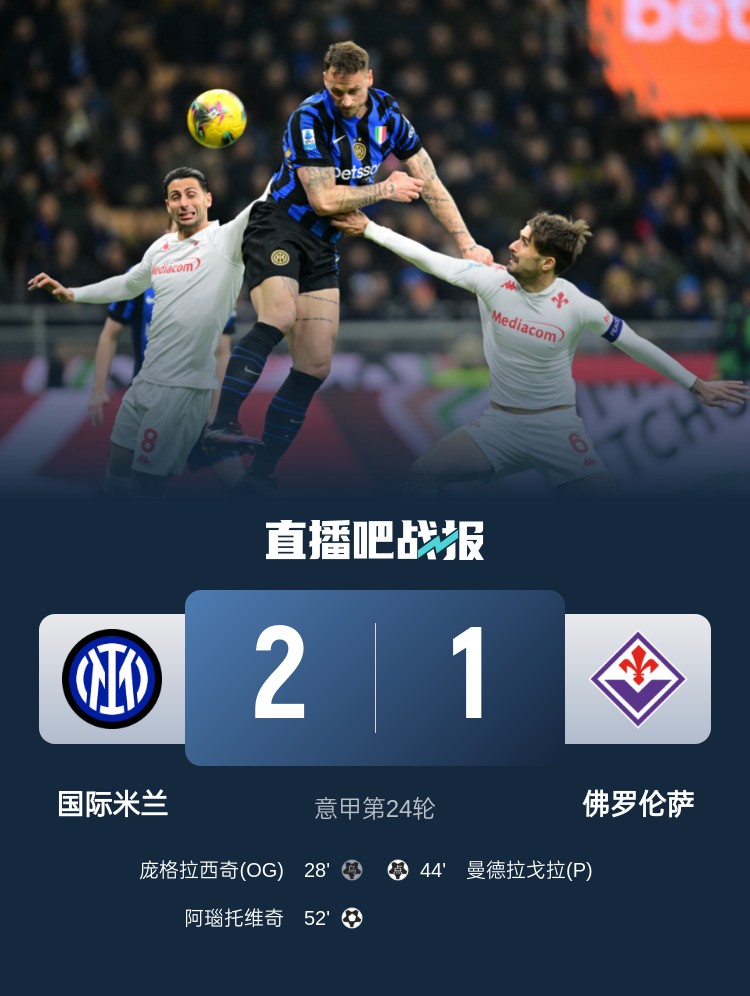 本輪意甲,國(guó)米2-1擊敗佛羅倫薩,勞塔羅造烏龍,阿瑙制勝。此役后國(guó)米距榜首1分。