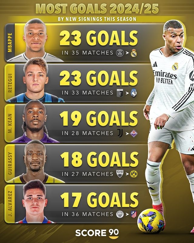 1、姆巴佩(巴黎→皇馬):35場(chǎng)23球