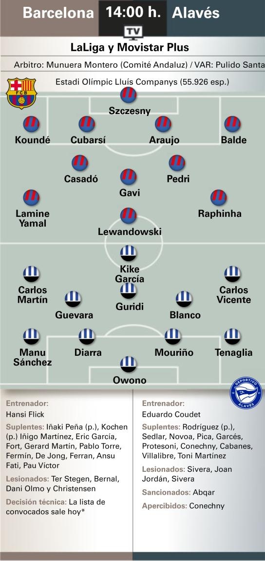 鋒線上,萊萬、拉菲尼亞和亞馬爾繼續(xù)聯(lián)袂首發(fā)。