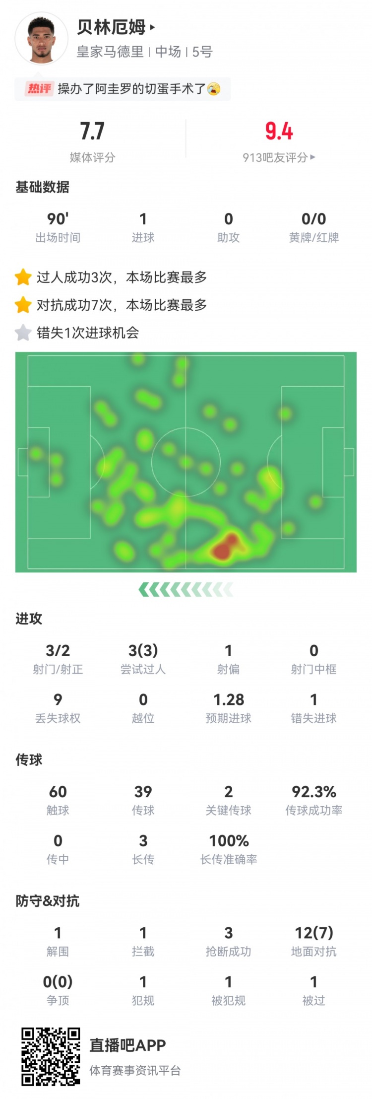 2月12日訊 歐冠淘汰賽附加賽首回合,曼城主場2-3遭皇馬絕殺。此役絕殺功臣貝林厄姆首發(fā)打滿全場,球員全場重點數據如下↓