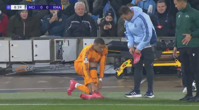 2月12日訊 歐冠淘汰賽附加賽首回合,曼城vs皇馬。比賽第9分鐘,姆巴佩的鞋帶被踩斷,跑到場邊更換球鞋。