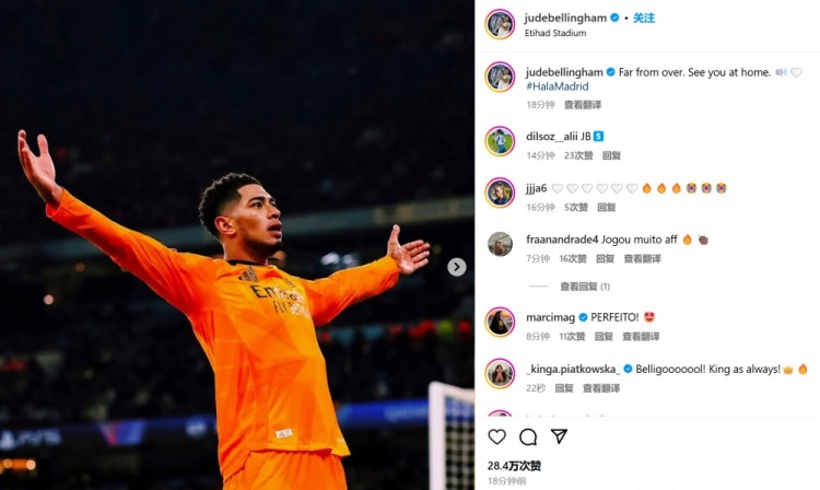 貝林厄姆也在賽后通過社媒曬出自己經(jīng)典的張臂慶祝照,并配文:“一切遠未結(jié)束。我們主場再見。馬德里前進!”