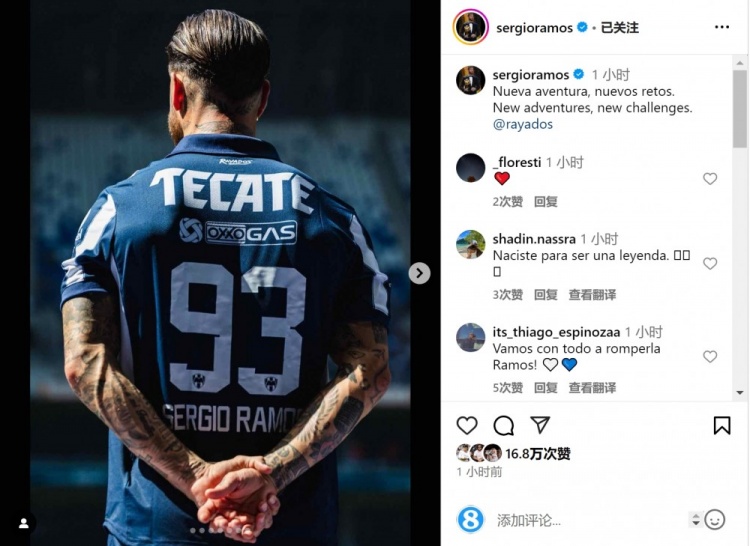 拉莫斯社媒曬出身穿蒙特雷93號(hào)球衣的背影照片,配文:“新的冒險(xiǎn),新的挑戰(zhàn)?!?/p>