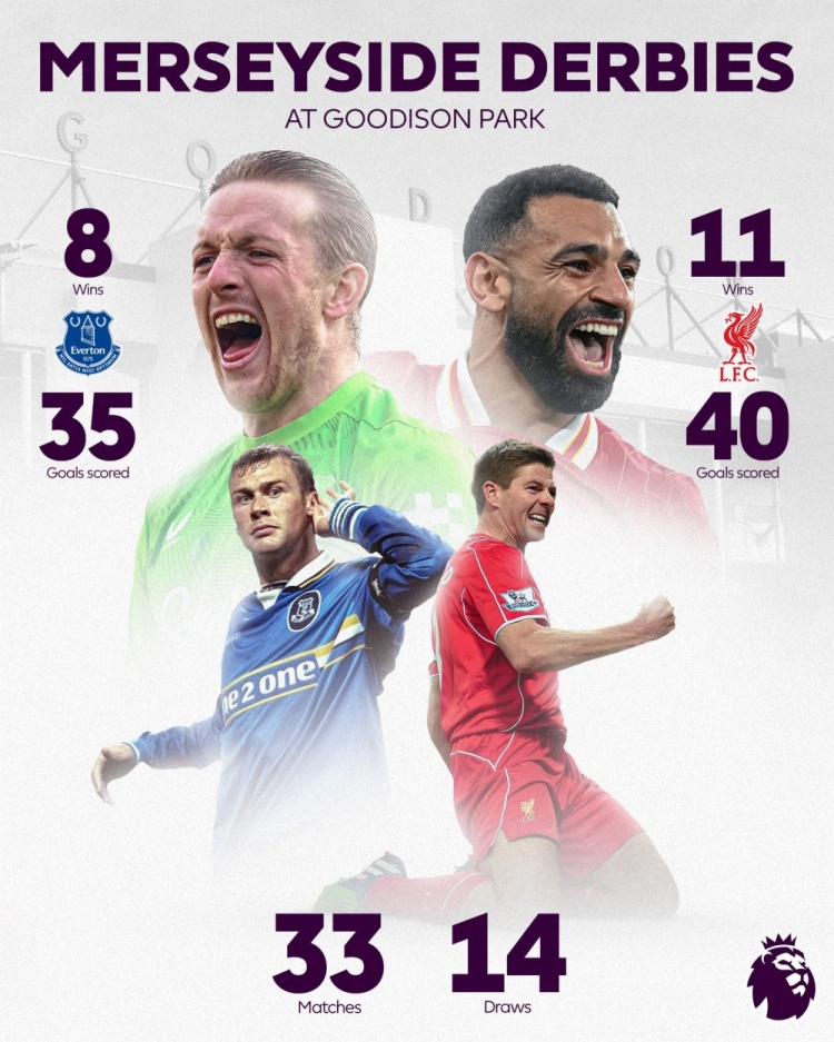 據(jù)官方統(tǒng)計,古迪遜公園球場共進行了33場英超默西塞德郡德比,利物浦11勝14平8負占優(yōu),打進40球丟35球。