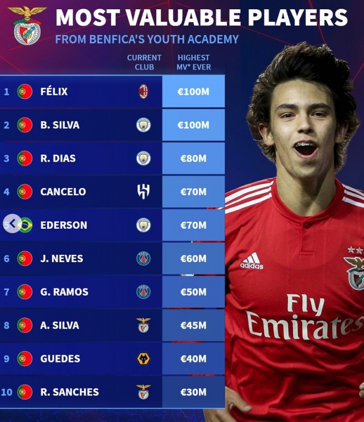 德轉列本菲卡青訓歷史最貴榜:B席領銜曼城3將,菲利克斯在列