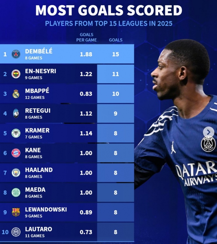 2月13日訊 《轉(zhuǎn)會市場》統(tǒng)計(jì)了2025年歐洲前15聯(lián)賽球員的各項(xiàng)賽事總進(jìn)球榜單,登貝萊領(lǐng)跑。