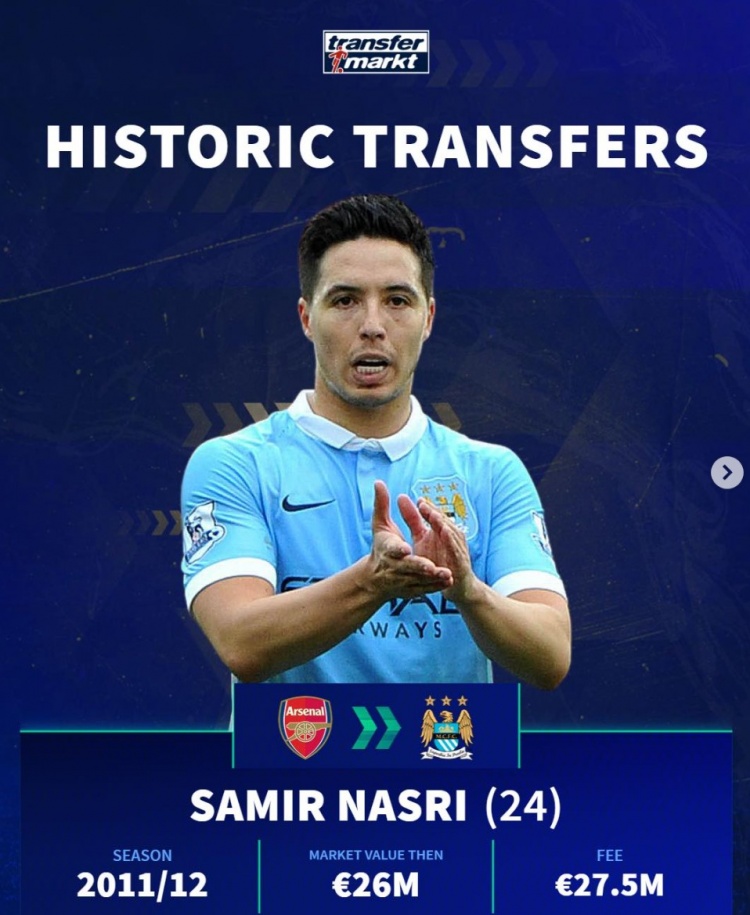 納斯里(阿森納→曼城):11-12賽季,24歲,身價2600萬歐,轉(zhuǎn)會費2750萬歐