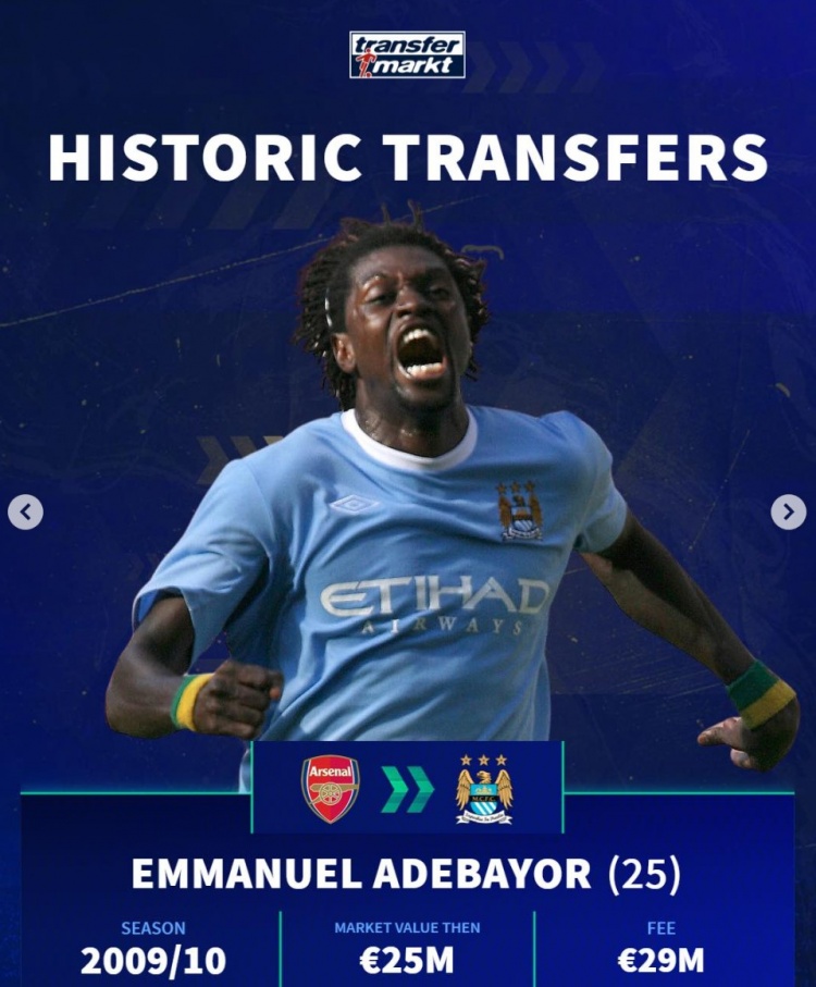 阿德巴約(阿森納→曼城):09-10賽季,25歲,身價2500萬歐,轉(zhuǎn)會費2900萬歐
