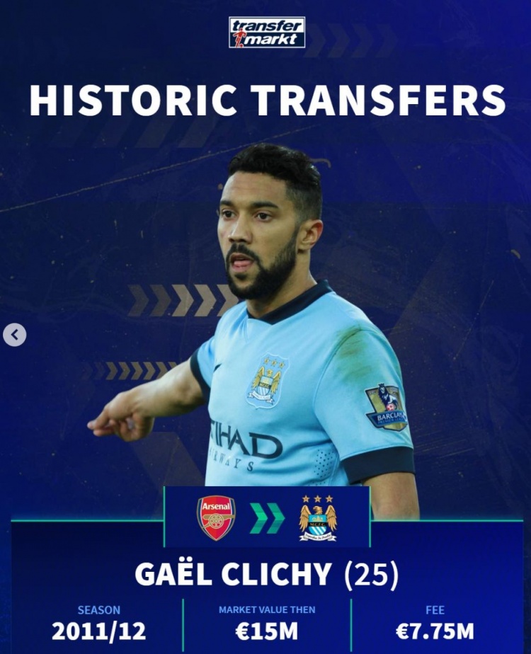 克里希(阿森納→曼城):11-12賽季,25歲,身價1500萬歐,轉(zhuǎn)會費775萬歐