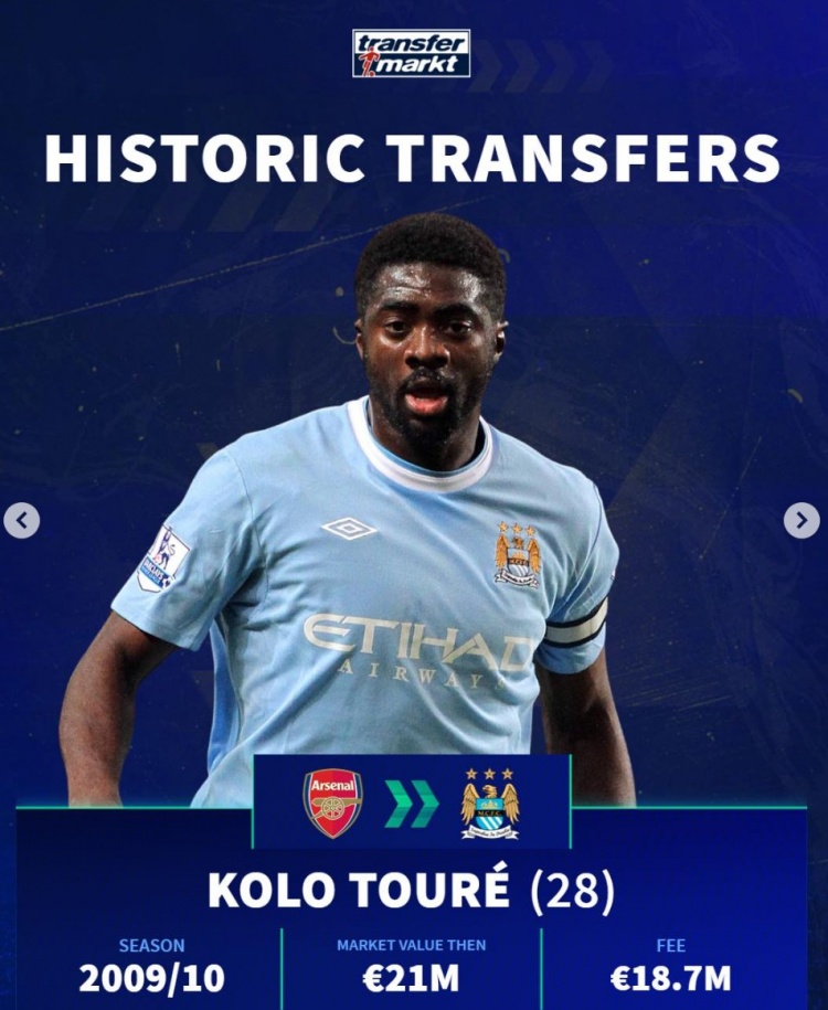 科洛-圖雷(阿森納→曼城):09-10賽季,28歲,身價2100萬歐,轉(zhuǎn)會費1870萬歐