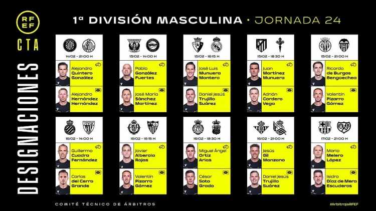 2月13日訊 西班牙足協(xié)今日公布了西甲第24輪各場比賽的裁判安排,具體如下: