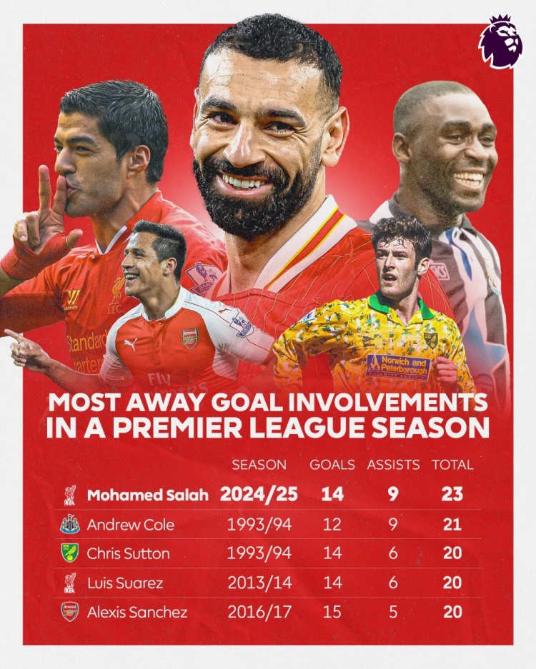 1、薩拉赫(2024-2025賽季)——23球(14球9助攻)