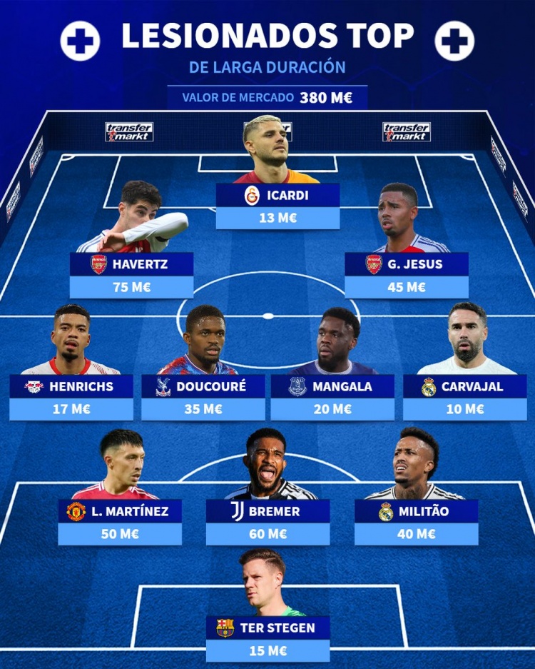 德轉(zhuǎn)列本賽季報銷球員身價最高陣容↓