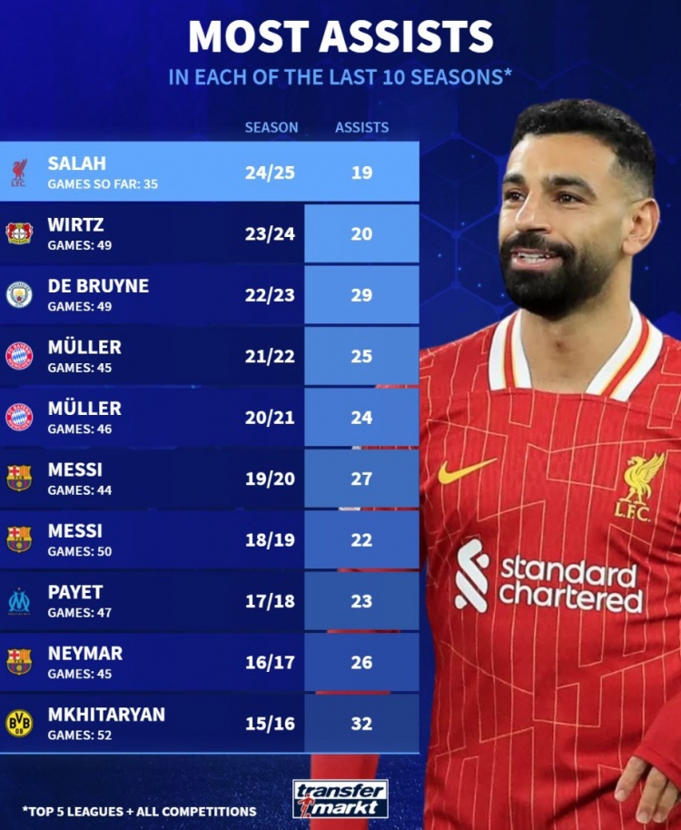 2月14日訊 薩拉赫在本賽季以19次助攻領跑五大聯賽各項賽事總助攻榜,《轉會市場》也列出了近10賽季的總助攻王情況。