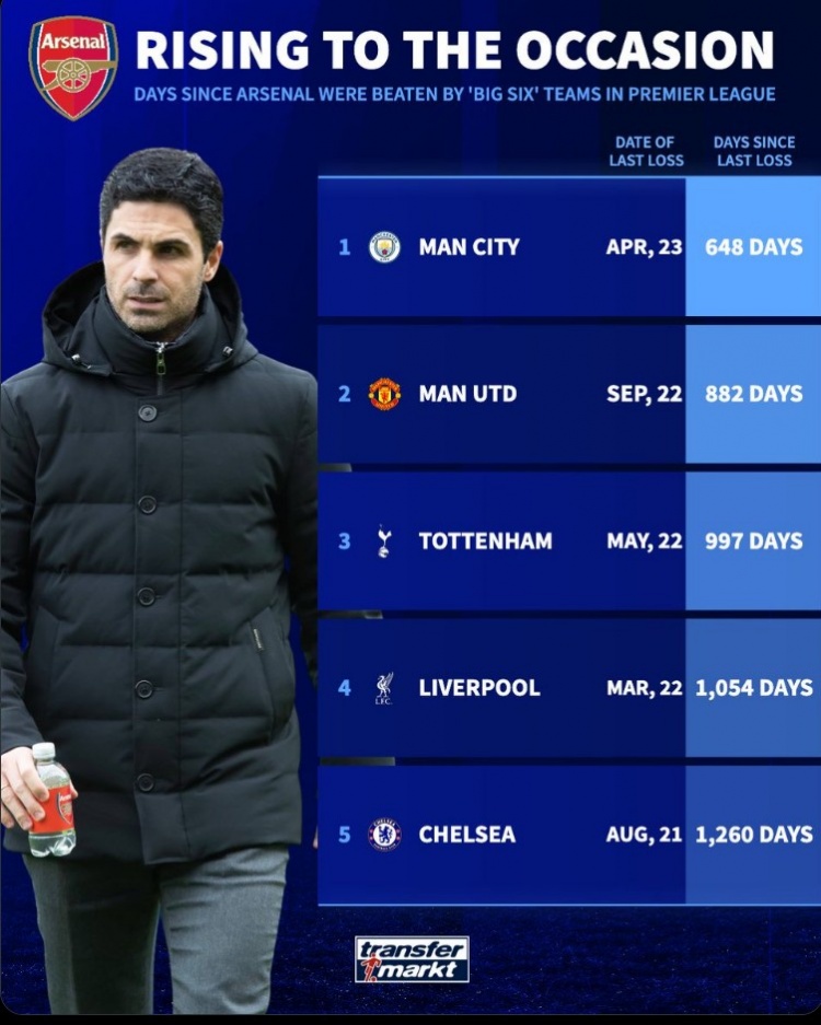 據(jù)統(tǒng)計(jì),阿森納上一次在英超輸給其他Big6球隊(duì)還在23年4月,當(dāng)時(shí)的對(duì)手正是曼城。以下為阿森納在英超上一次輸給其他big6球隊(duì)的時(shí)間以及相隔天數(shù):