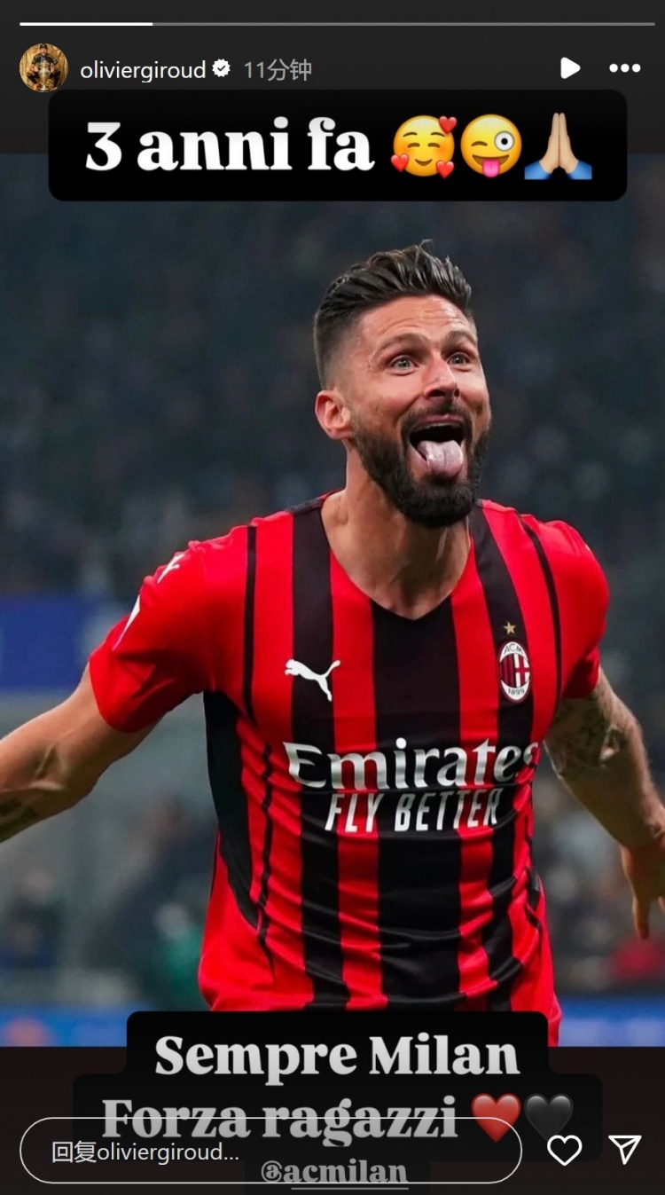 吉魯在社交媒體上曬出自己當(dāng)時慶祝進球的照片,配文:“三年前。永恒的米蘭,加油兄弟們!”