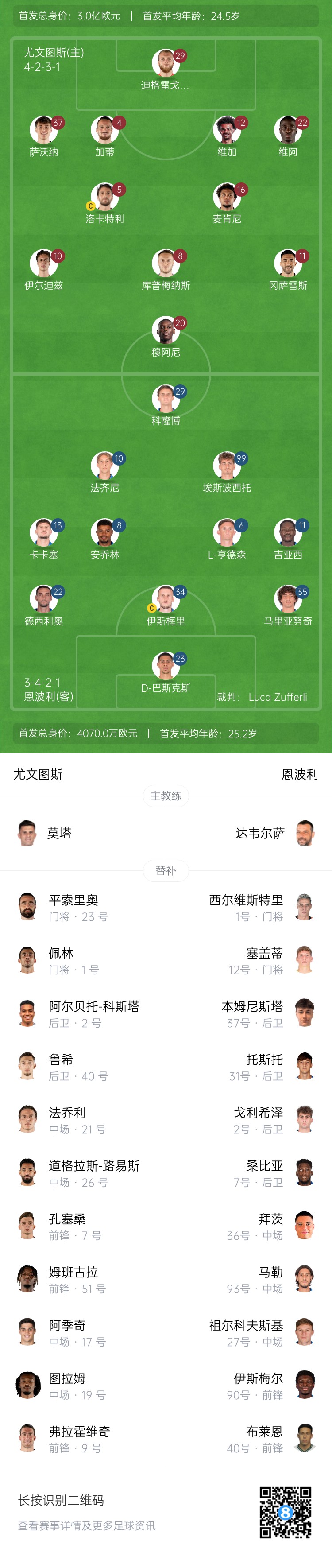 尤文替補(bǔ):1-佩林、23-平索里奧、2-阿爾貝托-科斯塔、40-魯希、19-凱夫倫-圖拉姆、21-法喬利、26-道格拉斯-路易斯、7-孔塞桑、9-弗拉霍維奇、17-阿季奇、51-姆班古拉