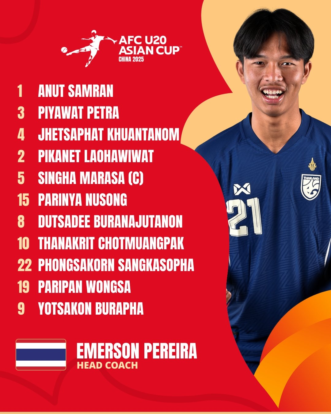 泰國U20首發(fā):1-阿努特、2-皮卡內(nèi)特-勞哈維瓦、3-皮亞瓦、4-杰薩帕、5-辛哈、15-帕里尼亞、8-杜薩迪、10-塔納吉、19-巴里班、22-豐薩空、9-約沙功