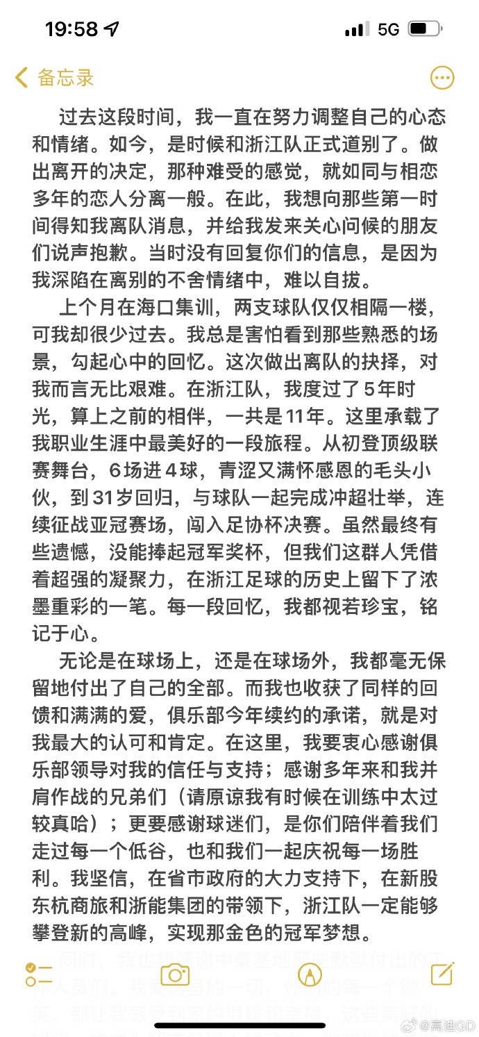 過去這段時(shí)間,我一直在努力調(diào)整自己的心態(tài)和情緒。如今,是時(shí)候和浙江隊(duì)正式道別了。做出離開的決定,那種難受的感覺,就如同與相戀多年的戀人分離一般。在此,我想向那些第一時(shí)間得知我離隊(duì)消息,并給我發(fā)來關(guān)心問候的朋友們說聲抱歉。當(dāng)時(shí)沒有回復(fù)你們的信息,是因?yàn)槲疑钕菰陔x別的不舍情緒中,難以自拔。