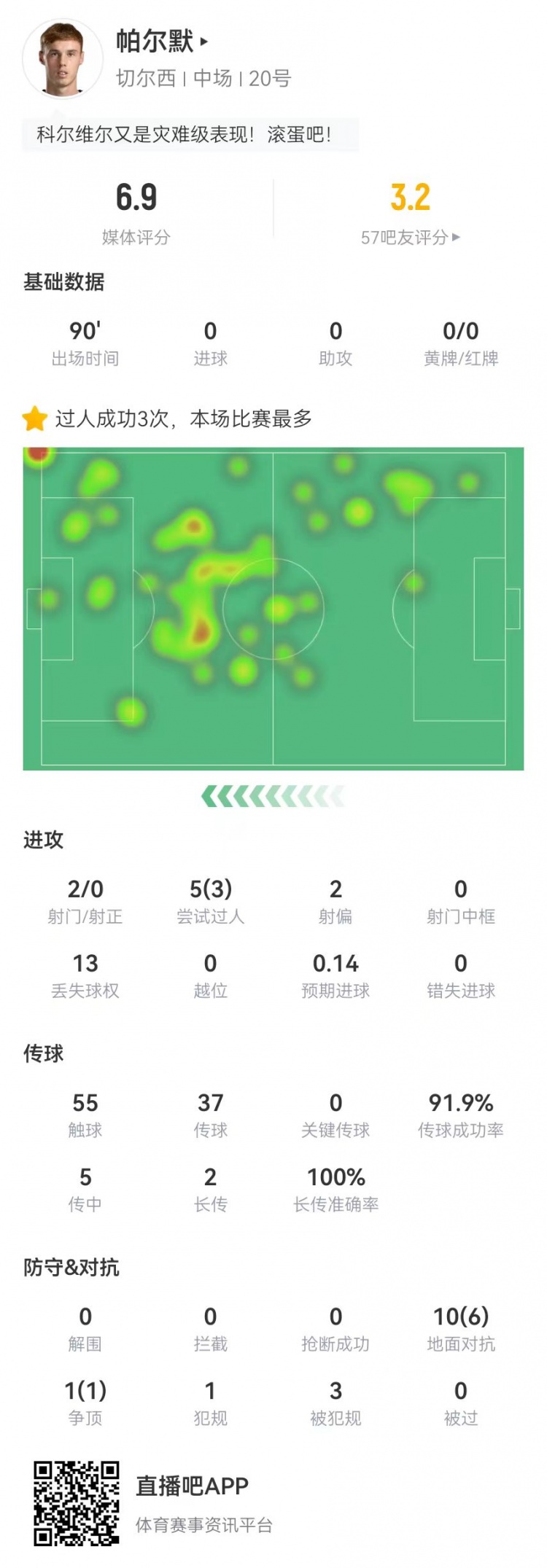 2月15日訊 切爾西在本輪英超0-3不敵布萊頓,帕爾默本場數(shù)據(jù)如下: