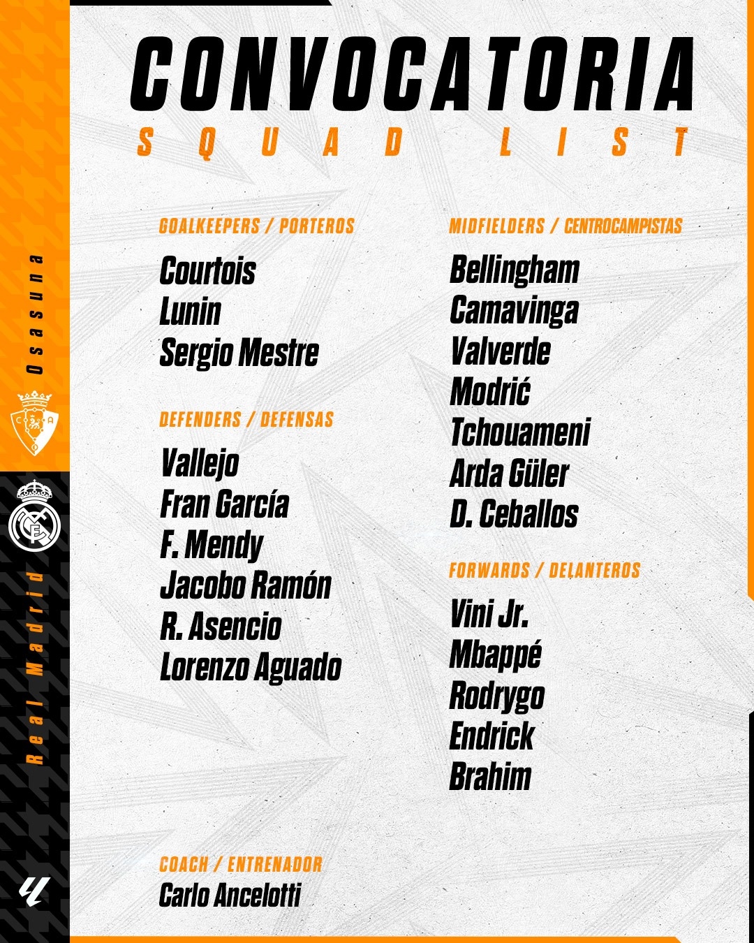 2月15日訊 在本輪西甲聯(lián)賽的一場比賽中,皇馬將赴客場對陣奧薩蘇納,賽前,皇馬公布了本場比賽的球員大名單,如下: