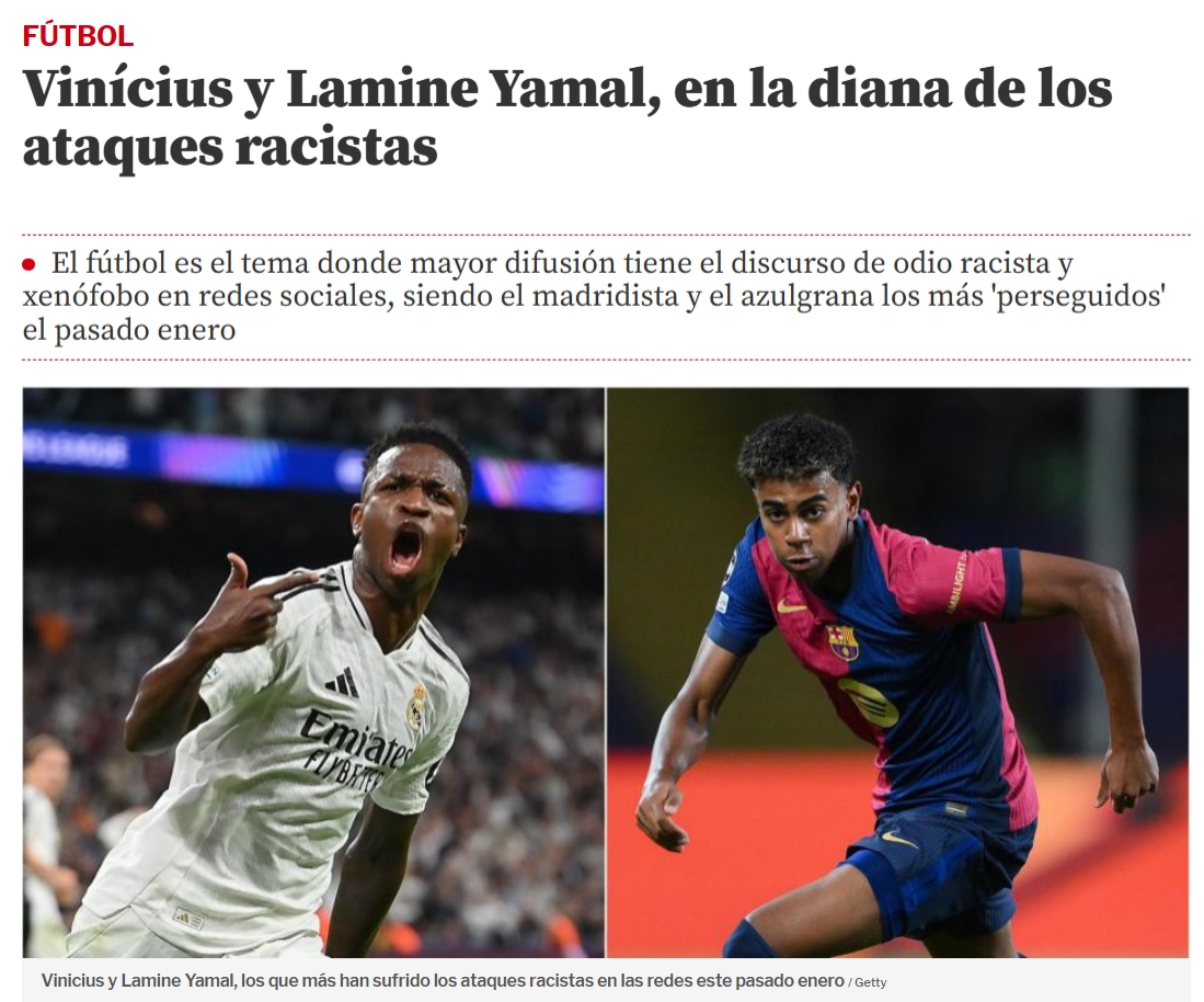 根據(jù)西班牙相關(guān)當(dāng)局最新報(bào)告顯示,足球領(lǐng)域已成為西班牙社交媒體上種族主義和仇外仇恨言論滋生最嚴(yán)重、傳播最廣泛的領(lǐng)域?;蜀R球星維尼修斯和巴薩新星亞馬爾成為主要被攻擊目標(biāo),這些充滿攻擊性的言論試圖通過"非人化"受害者來達(dá)到攻擊目的。