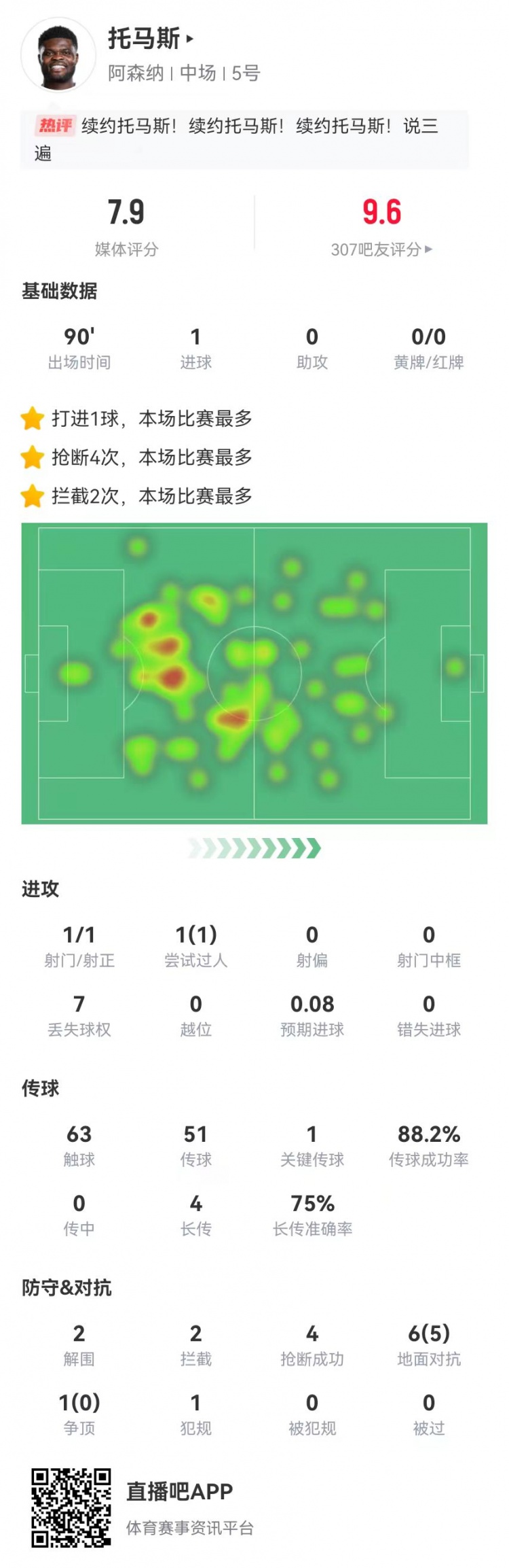 2月3日訊 阿森納在本輪英超5-1大勝曼城,托馬斯本場(chǎng)數(shù)據(jù)如下:
