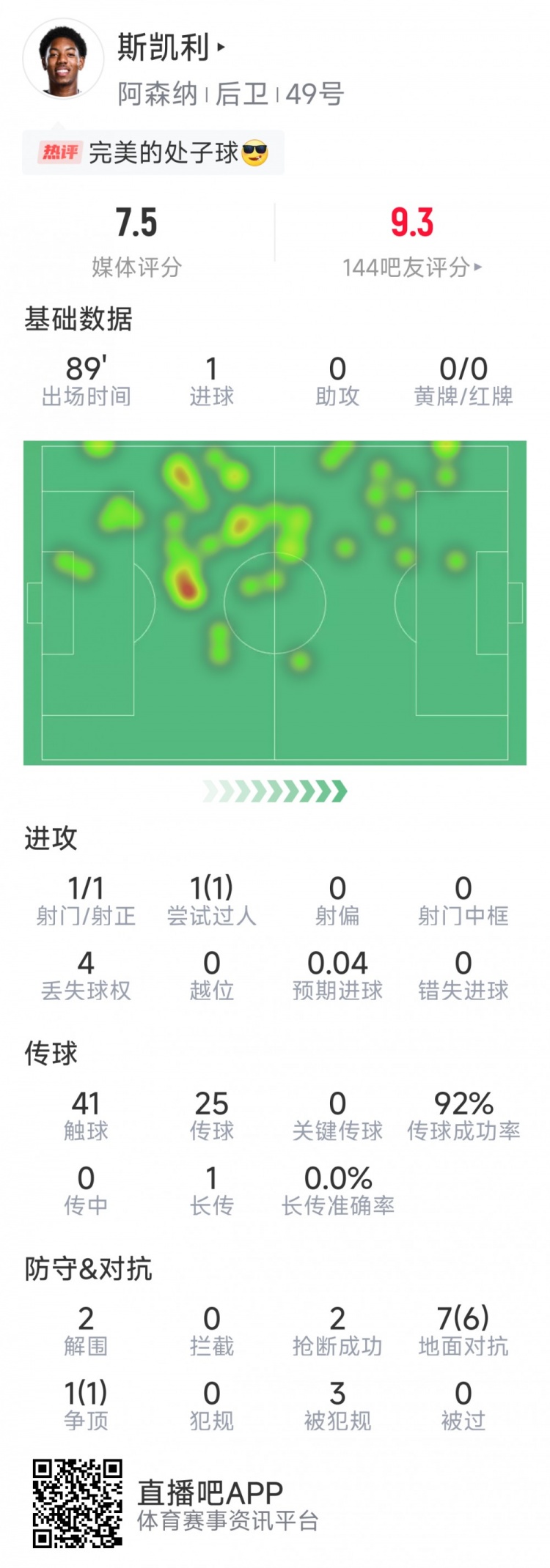2月3日訊 在本輪英超阿森納對(duì)陣曼城的比賽中,小將斯凱利發(fā)揮出色,以下為他在本場(chǎng)數(shù)據(jù):