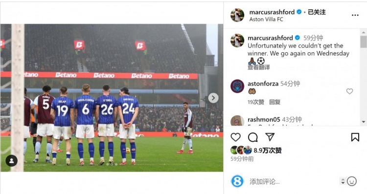 拉什福德賽后在社交媒體上曬出自己主罰任意球的照片,配文:“很遺憾我們未能攻入制勝球,下周三我們繼續(xù)加油(對(duì)陣?yán)锲郑??!?/p>